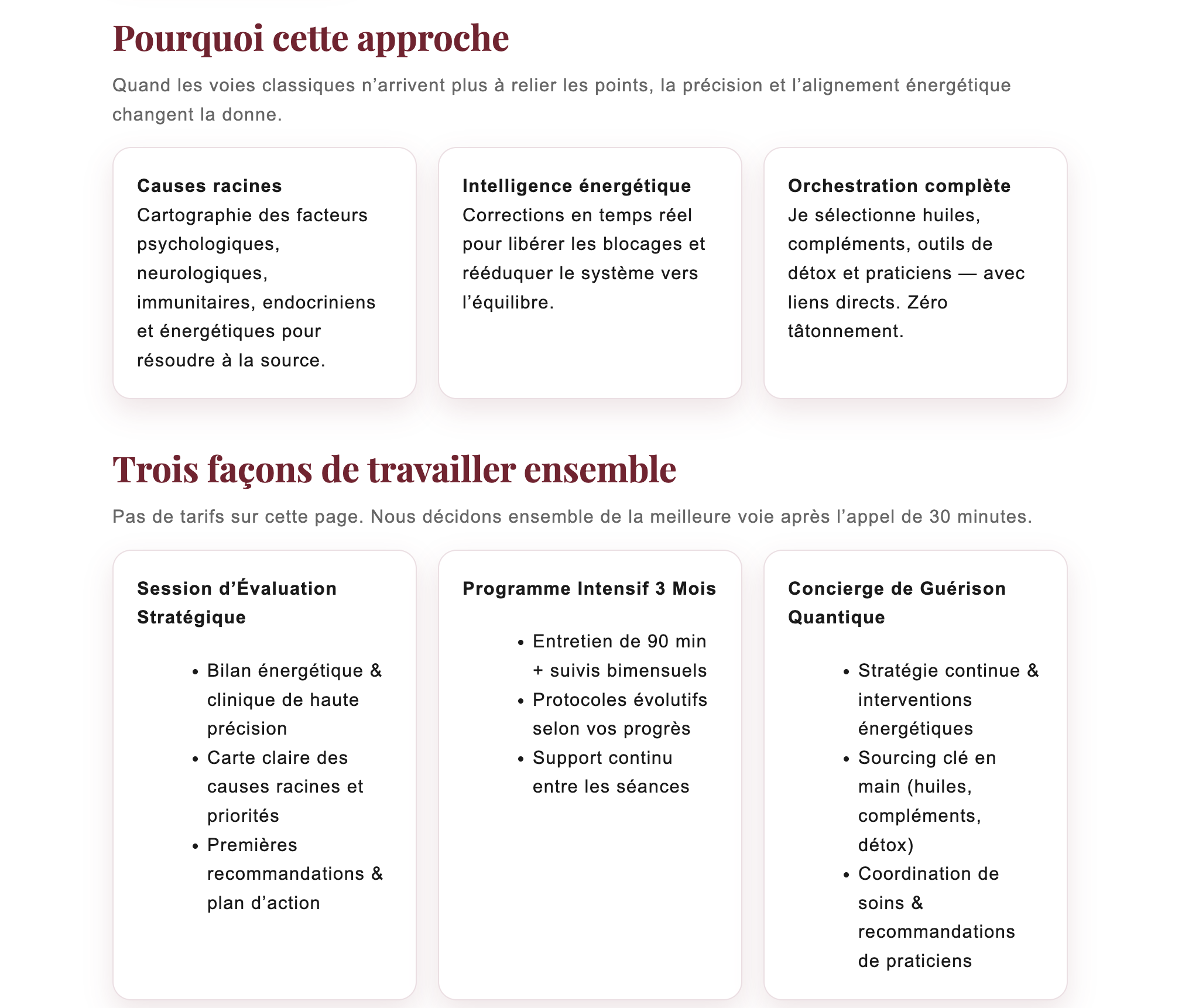 Une approche de haut niveau, entièrement personnalisée, qui réunit aromathérapie clinique, médecine énergétique et investigation des causes racines. Ici, on va au delà des symptômes pour restaurer votre équilibre en profondeur - physique, émotionnel, hormonal et énergétique.